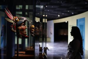 (250221) -- CIUDAD DE MEXICO, 21 febrero, 2025 (Xinhua) -- Imagen del 17 de febrero de 2025 de una mujer visitando la exposición "Cuauhtémoc. Historia y Memoria" en el Museo del Templo Mayor, en la Ciudad de México, capital de México. Una exposición que recorre la vida, obra y legado del último gobernante del imperio azteca, Cuauhtémoc, se presenta por primera vez en el Museo del Templo Mayor de la Ciudad de México. (Xinhua/Francisco Cañedo) (fc) (jg) (da) (vf)