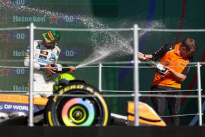 (251027) -- CIUDAD DE MEXICO, 27 octubre, 2025 (Xinhua) -- Imagen del 26 de octubre de 2025 del ganador del primer lugar, el piloto británico de la escudería McLaren, Lando Norris (i), festejando al término del Gran Premio de la Ciudad de México 2025 de Fórmula Uno, en el Autódromo Hermanos Rodríguez, en la Ciudad de México, capital de México. (Xinhua/Song Haiyuan) (rtg) (ah) (ce)