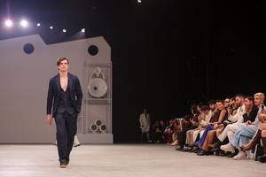 (251018) — CIUDAD DE MEXICO, 18 octubre, 2025 (Xinhua) — Imagen del 17 de octubre de 2025 de un modelo presentando una creación de Harris & Frank durante la Volvo Fashion Week México 2025, en la Ciudad de México, capital de México. (Xinhua/Francisco Cañedo) (fc) (oa) (da)