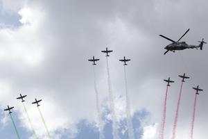 (250916) -- CIUDAD DE MEXICO, 16 septiembre, 2025 (Xinhua) -- Aviones militares vuelan en formación durante el Desfile Cívico Militar en conmemoración del 215 aniversario de la Independencia de México, en la Ciudad de México, capital de México, el 16 de septiembre de 2025. México celebró el martes el aniversario 215 del inicio de la lucha independentista contra el colonialismo español con la realización del tradicional Desfile Cívico Militar en la Ciudad de México, con la particularidad de que por primera ocasión se presentaron honores y se rindió el parte de novedades a una mujer, Claudia Sheinbaum, primera presidenta y comandanta suprema de las Fuerzas Armadas del país latinoamericano. (Xinhua/Francisco Cañedo) (fc) (oa) (ah) (ce)