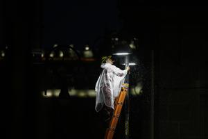(250712) — CIUDAD DE MEXICO, 12 julio, 2025 (Xinhua) — Imagen del 11 de julio de 2025 de un hombre realizando una reparación del alumbrado público bajo la lluvia, en la Ciudad de México, capital de México. (Xinhua/Francisco Cañedo) (fc) (jg) (da)