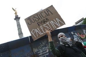 (250616) -- CIUDAD DE MEXICO, 16 junio, 2025 (Xinhua) -- Imagen del 15 de junio de 2025 de un hombre participando en una protesta en apoyo a Palestina, en la Ciudad de México, capital de México. (Xinhua/Francisco Cañedo) (fc) (oa) (rtg) (ce)