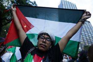 (251007) -- CIUDAD DE MEXICO, 7 octubre, 2025 (Xinhua) -- Un hombre participa en una marcha en apoyo a Palestina, en la Ciudad de México, capital de México, el 7 de octubre 2025. (Xinhua/Francisco Cañedo) (fc) (vf) (ce)