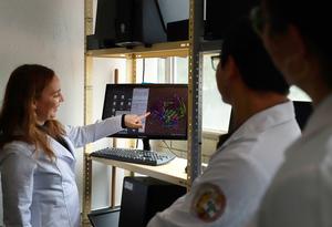 (250626) -- CIUDAD DE MEXICO, 26 junio, 2025 (Xinhua) -- Imagen del 18 de junio de 2025 de la científica de la Escuela Superior de Medicina del Instituto Politécnico Nacional de México, Marlet Themis Martínez Archundia (i), mostrando un diseño digital de fármacos, en la Ciudad de México, capital de México. Un equipo de científicos mexicanos desarrolla nuevos compuestos para el tratamiento del cáncer de mama con mayor especificidad, al dirigirse únicamente a las células cancerígenas y así lograr la nulidad o el mínimo efecto secundario en el daño al tejido sano. (Xinhua/Pool Contreras) (fc) (jg) (da) (vf)