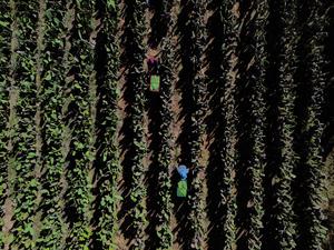 (260215) -- CIUDAD DE MEXICO, 15 febrero, 2026 (Xinhua) -- Imagen tomada con un dron el 22 de enero de 2026 de personas trabajando en un campo de cultivo de nopal, en la alcaldía Milpa Alta, en la Ciudad de México, capital de México. El nopal continúa consolidándose como el "oro verde" de la gastronomía mexicana. Este cultivo transita un camino que une la tradición agrícola con la mesa de millones de hogares. (Xinhua/Francisco Cañedo) (fc) (ah)