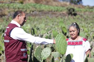 (260215) -- CIUDAD DE MEXICO, 15 febrero, 2026 (Xinhua) -- Imagen del 22 de enero de 2026 de la productora, Silvia Laguna (d), y el técnico productivo de la Comisión de Recursos Naturales y Desarrollo Rural (Corenadr), Alfred Villaruel (i), conversando en un campo de cultivo de nopal, en la alcaldía Milpa Alta, en la Ciudad de México, capital de México. El nopal continúa consolidándose como el "oro verde" de la gastronomía mexicana. Este cultivo transita un camino que une la tradición agrícola con la mesa de millones de hogares. (Xinhua/Francisco Cañedo) (fc) (ah)