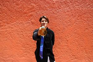 (250909) — CIUDAD DE MEXICO, 9 septiembre, 2025 (Xinhua) — Imagen del 6 de septiembre de 2025 del clavadista mexicano, Osmar Olvera, mostrando su medalla durante una entrevista con la Agencia de Noticias Xinhua, en la Ciudad de México, capital de México. La sonrisa de Osmar Olvera aún refleja la emoción de lo vivido hace pocos días en el Campeonato Mundial de Clavados de Singapur 2025, donde consiguió colgarse la medalla de oro en el trampolín de tres metros. (Xinhua/Daniel Augusto) (fc) (jg) (ra) (ce)