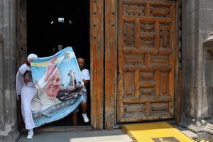 (250421) -- CIUDAD DE MEXICO, 21 abril, 2025 (Xinhua) -- Personas sostienen una pancarta con la imagen del papa Francisco después del anuncio de su fallecimiento, en la Catedral Metropolitana, en la Ciudad de México, capital de México, el 21 de abril de 2025. El papa Francisco, nacido Jorge Mario Bergoglio, falleció el lunes a los 88 años de edad, anunció el Vaticano en un comunicado. El 266º pontífice de la Iglesia católica romana nació el 17 de diciembre de 1936 en Buenos Aires, Argentina, y asumió el pontificado en 2013. (Xinhua/Str) (rtg) (ah) (ce)