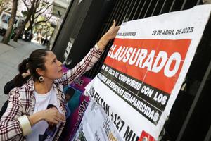 (250410) -- CIUDAD DE MEXICO, 10 abril, 2025 (Xinhua) -- Una mujer coloca un cartel durante la clausura simbólica del Senado de la República por parte de colectivos de búsqueda, en la Ciudad de México, capital de México, el 10 de abril de 2025. (Xinhua/Francisco Cañedo) (fc) (rtg) (ra) (vf)