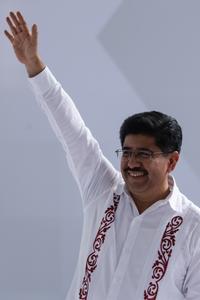 (250902) -- CIUDAD DE MEXICO, 2 septiembre, 2025 (Xinhua) -- Imagen del 1 de septiembre de 2025 del presidente de la Suprema Corte de Justicia de la Nación (SCJN), Hugo Aguilar Ortiz, saludando durante una tradicional ceremonia de purificación y la entrega del bastón de mando y servicio, en la Ciudad de México, capital de México. Con una tradicional ceremonia de purificación y la entrega del bastón de mando y servicio, símbolo del poder político y espiritual de los pueblos originarios de México y afromexicanos, inició el lunes la nueva era de la SCJN, elegida este año por vez primera en la historia del país por elección popular. (Xinhua/Francisco Cañedo) (fc) (oa) (ah) (vf)