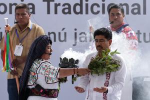 (250902) — CIUDAD DE MEXICO, 2 septiembre, 2025 (Xinhua) — Imagen del 1 de septiembre de 2025 del presidente de la Suprema Corte de Justicia de la Nación (SCJN), Hugo Aguilar Ortiz (d-frente), participando en una tradicional ceremonia de purificación y la entrega del bastón de mando y servicio, en la Ciudad de México, capital de México. Con una tradicional ceremonia de purificación y la entrega del bastón de mando y servicio, símbolo del poder político y espiritual de los pueblos originarios de México y afromexicanos, inició el lunes la nueva era de la SCJN, elegida este año por vez primera en la historia del país por elección popular. (Xinhua/Francisco Cañedo) (fc) (oa) (ah) (vf)
