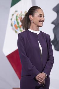 (250407) -- CIUDAD DE MEXICO, 7 abril, 2025 (Xinhua) -- Imagen cedida por la Presidencia de México de la presidenta mexicana, Claudia Sheinbaum, sonriendo durante su conferencia de prensa matutina, en Palacio Nacional, en la Ciudad de México, capital de México, el 7 de abril de 2025. Sheinbaum afirmó el lunes la importancia que tiene en la actualidad mantener la unidad de América Latina y el Caribe, al considerar oportuno hablar de ello durante la IX Cumbre de la Comunidad de Estados Latinoamericanos y Caribeños (CELAC), a llevarse a cabo esta semana en la ciudad de Tegucigalpa, Honduras. (Xinhua/Presidencia de México) (vf)