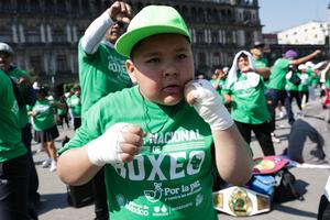 (250406) -- CIUDAD DE MEXICO, 6 abril, 2025 (Xinhua) -- Un niño participa en la Clase Nacional de Boxeo llevada a cabo en el Zócalo de la Ciudad de México, capital de México, el 6 de abril de 2025. La presidenta mexicana, Claudia Sheinbaum, encabezó el domingo junto a varias leyendas del deporte mexicano el arranque de una clase masiva de boxeo en la plaza central de la Ciudad de México, actividad que se llevó a cabo de manera simultánea en las principales plazas de las entidades del país.(Xinhua/Francisco Cañedo) (fc) (rtg) (ah)