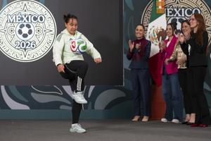 (260305) -- CIUDAD DE MEXICO, 5 marzo, 2026 (Xinhua) -- Imagen proveída por la Presidencia de México de la futbolista mexicana, Charlyn Corral (i), dominando un balón durante la conferencia de prensa matutina de la presidenta mexicana, Claudia Sheinbaum (2-i), en Palacio Nacional, en la Ciudad de México, capital de México, el 5 de marzo de 2026. (Xinhua/Presidencia de México) (rtg) (ra) (vf)