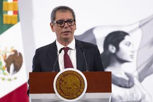 (250505) -- CIUDAD DE MEXICO, 5 mayo, 2025 (Xinhua) -- Imagen cedida por la Presidencia de México del secretario de Hacienda de México, Edgar Amador Zamora, hablando durante la conferencia de prensa matutina de la presidenta mexicana, Claudia Sheinbaum, en Palacio Nacional, en la Ciudad de México, capital de México, el 5 de mayo de 2025. El Gobierno de México estimó el lunes que la economía local podría crecer un 2,7 por ciento anual, gracias a la aplicación de medidas para aumentar las compras gubernamentales de productos nacionales, sustituir importaciones y estimular la demanda interna. (Xinhua/Presidencia de México) (oa) (ah) (ce)