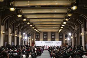 (250314) -- CIUDAD DE MEXICO, 14 marzo, 2025 (Xinhua) -- La presidenta mexicana, Claudia Sheinbaum (i-atrás), habla durante la inauguración de la Conferencia Mundial de Mujeres Parlamentarias de la Unión Interparlamentaria (UIP) 2025, en la Ciudad de México, capital de México, el 14 de marzo de 2025. (Xinhua/Francisco Cañedo) (fc) (jg) (da) (vf)