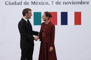 (251108) -- CIUDAD DE MEXICO, 8 noviembre, 2025 (Xinhua) -- Imagen del 7 de noviembre de 2025 de la presidenta mexicana, Claudia Sheinbaum (d), estrechando la mano del visitante presidente francés, Emmanuel Macron (i), durante una conferencia de prensa conjunta en Palacio Nacional, en la Ciudad de México, capital de México. (Xinhua/Daniel Augusto) (oa) (da)