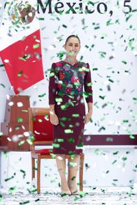 (251005) -- CIUDAD DE MEXICO, 5 octubre, 2025 (Xinhua) -- La presidenta mexicana, Claudia Sheinbaum, reacciona durante el evento "La transformación avanza", en la Ciudad de México, capital de México, el 5 de octubre de 2025. Sheinbaum celebró el domingo su primer año de Gobierno iniciado el 1 de octubre de 2024 con un mensaje público en la plaza central de la capital del país, en el que reafirmó su compromiso de defender al país y rechazó cualquier injerencia extranjera o violación del territorio mexicano. (Xinhua/Francisco Cañedo) (fc) (oa) (ah)