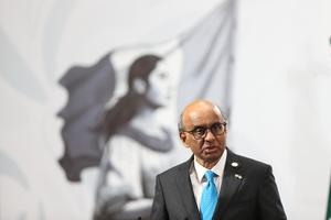 (251201) -- CIUDAD DE MEXICO, 1 diciembre, 2025 (Xinhua) -- El presidente de Singapur, Tharman Shanmugaratnam, habla durante una conferencia de prensa conjunta con la presidenta mexicana, Claudia Sheinbaum, en Palacio Nacional, en la Ciudad de México, capital de México, el 1 de diciembre de 2025. (Xinhua/Francisco Cañedo) (fc) (oa) (ah) (vf)