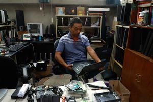 (251028) -- CIUDAD DE MEXICO, 28 octubre, 2025 (Xinhua) -- Imagen del 3 de octubre de 2025 del coordinador de la iniciativa denominada "Reciclatrón de Ciencias", Luis Alberto Vázquez Maison, técnico académico del Departamento de Matemáticas de la Facultad de Ciencias de la Universidad Nacional Autónoma de México (UNAM), revisando una computadora, en la Ciudad de México, capital de México. Entre cables, memorias y pantallas, un grupo de académicos de la Facultad de Ciencias de la UNAM ha encontrado una forma de transformar el desecho en oportunidad, al recuperar computadoras en desuso para darles nueva vida y ayudar así a cuidar el medio ambiente, además de evitar que los jóvenes abandonen sus estudios. (Xinhua/Pool Contreras) (fc) (jg) (ra) (ce)