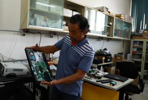 (251028) — CIUDAD DE MEXICO, 28 octubre, 2025 (Xinhua) — Imagen del 3 de octubre de 2025 del coordinador de la iniciativa denominada «Reciclatrón de Ciencias», Luis Alberto Vázquez Maison, técnico académico del Departamento de Matemáticas de la Facultad de Ciencias de la Universidad Nacional Autónoma de México (UNAM), revisando una computadora, en la Ciudad de México, capital de México. Entre cables, memorias y pantallas, un grupo de académicos de la Facultad de Ciencias de la UNAM ha encontrado una forma de transformar el desecho en oportunidad, al recuperar computadoras en desuso para darles nueva vida y ayudar así a cuidar el medio ambiente, además de evitar que los jóvenes abandonen sus estudios. (Xinhua/Pool Contreras) (fc) (jg) (ra) (ce)