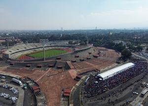 (251112) -- CIUDAD DE MEXICO, 12 noviembre, 2025 (Xinhua) -- Imagen tomada con un dron el 12 de noviembre de 2025 del Mega Centro de Vacunación UNAM 2025, en el Estadio Olímpico Universitario, en la Ciudad de México, capital de México. (Xinhua/Francisco Cañedo) (fc) (jg) (da) (ce)