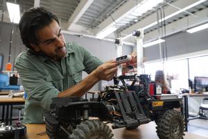 (251121) — CIUDAD DE MEXICO, 21 noviembre, 2025 (Xinhua) — Imagen del 19 de noviembre de 2025 del doctor, Rodolfo Vera Amaro, de la Unidad Profesional Interdisciplinaria en Ingeniería y Tecnologías Avanzadas del Instituto Politécnico Nacional (IPN) de México, trabajando en un vehículo robótico (rover), en la Ciudad de México, capital de México. Estudiantes del IPN de México desarrollaron un rover, equipado con redes neuronales y visión artificial, capaz de identificar riesgos geológicos, detectar condiciones extremas y reconocer la presencia de gases tóxicos en zonas mineras. (Xinhua/Francisco Cañedo) (fc) (oa) (ra) (ce)