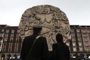 (250712) -- CIUDAD DE MEXICO, 12 julio, 2025 (Xinhua) -- Imagen del 11 de julio de 2025 de personas observando una pieza exhibida durante el espectáculo de videomapping "Memoria Luminosa. México Tenochtitlan 700 años" llevado a cabo en el marco de la conmemoración de los 700 años de la fundación de México Tenochtitlan, en el Zócalo de la Ciudad de México, capital de México. (Xinhua/Francisco Cañedo) (fc) (jg) (da)