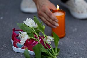 (250316) -- CIUDAD DE MEXICO, 16 marzo, 2025 (Xinhua) -- Imagen del 15 de marzo de 2025 de una mujer colocando una veladora encendida durante una vigilia ante el hallazgo de un campo de reclutamiento con crematorios y fosas clandestinas supuestamente del crimen organizado en el municipio de Teuchitlán, Jalisco, en el Zócalo de la Ciudad de México, capital de México. (Xinhua/Francisco Cañedo) (fc) (ah)