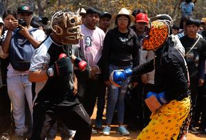 (250504) -- GUERRERO, 4 mayo, 2025 (Xinhua) -- Imagen del 3 de mayo de 2025 de hombres participando en una pelea como parte de los rituales prehispánicos para la petición de las lluvias, en el municipio de Acatlán, en el estado de Guerrero, en el sur de México. (Xinhua/Franyeli García) (fg) (oa) (ah)