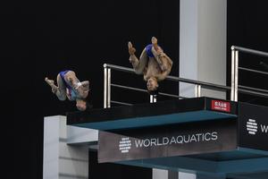 (250405) — JALISCO, 5 abril, 2025 (Xinhua) — Imagen del 4 de abril de 2025 de Chen Yuxi (i) y Cheng Zilong (d), de China, compitiendo durante la final por equipos mixtos de 3 y 10 metros en la Copa Mundial de Clavados, en Guadalajara, estado de Jalisco, México. (Xinhua/Diana Márquez) (oa) (da)