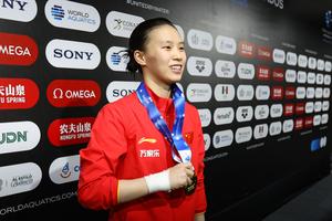 (250406) -- GUADALAJARA, 6 abril, 2025 (Xinhua) -- Imagen del 5 de abril de 2025 de la medallista de oro Chen Yuxi, de China, posando después de la ceremonia de premiación de la final de plataforma de 10 metros femeninos en la Copa Mundial de Clavados, en Guadalajara, estado de Jalisco, México. (Xinhua/Diana Márquez) (fc) (oa) (ah)