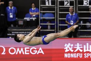(250407) -- GUADALAJARA, 7 abril, 2025 (Xinhua) -- Imagen del 6 de abril de 2025 de Cheng Zilong, de China, compitiendo durante la final de plataforma de 10 metros masculinos en la Copa Mundial de Clavados, en Guadalajara, estado de Jalisco, México. (Xinhua/Diana Márquez) (oa) (ah) (vf)