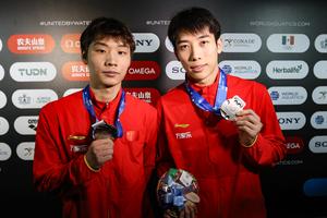 (250406) -- JALISCO, 6 abril, 2025 (Xinhua) -- Hu Yukang y Zheng Jiuyuan, de China, muestran sus medallas de plata después la ceremonia de premiación de la final de clavados sincronizados de 3 metros masculinos en la Copa Mundial de Clavados, en Guadalajara, estado de Jalisco, México, el 6 de abril de 2025. (Xinhua/Diana Márquez) (fc) (oa) (da)