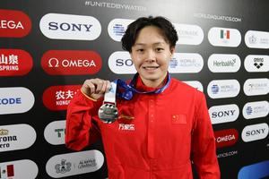 (250407) -- GUADALAJARA, 7 abril, 2025 (Xinhua) -- Imagen del 6 de abril de 2025 de la medallista de plata, Chen Yiwen, de China, posando al término de la ceremonia de premiación de la final de trampolín de 3 metros femeninos en la Copa Mundial de Clavados, en Guadalajara, estado de Jalisco, México. (Xinhua/Diana Márquez) (oa) (ah) (ce)