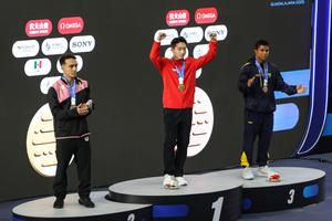 (250406) --GUADALAJARA, abril 6, 2025 (Xinhua) -- Imagen del 5 de abril de 2025 del medallista de oro Wang Zongyuan (c), de China, el medallista de plata Juan Manuel Celaya Hernández (i), de México, y el medallista de bronce Luis Felipe Uribe Bermúdez, de Colombia, reaccionando durante la ceremonia de premiación de la final de trampolín de 3 metros masculinos en la Copa Mundial de Clavados, en Guadalajara, estado de Jalisco, México. (Xinhua/Diana Márquez) (fc) (oa) (ah)