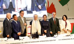 (251130) -- JALISCO, 30 noviembre, 2025 (Xinhua) -- Imagen del 29 de noviembre de 2025 del presidente de la Feria Internacional del Libro (FIL) de Guadalajara, Trinidad Padilla López (i), el gobernador de Jalisco, Pablo Lemus (2-i), el secretario de Economía de México, Marcelo Ebrard (3-i), la rectora de la Universidad de Guadalajara, Karla Planter (3-d), y el alcalde de Barcelona, Jaume Collboni (2-d), participando durante la inauguración de la 39ª edición de la FIL de Guadalajara, en la ciudad de Guadalajara, estado de Jalisco, México. La FIL de Guadalajara inició el sábado sus actividades en México con la entrega del Premio FIL de Literatura en Lenguas Romances 2025 al escritor franco-libanés Amin Maalouf, reconocido por ser una de las voces más representativas de la literatura francesa contemporánea. (Xinhua/Diana Márquez) (fc) (rtg) (da)