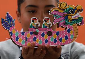 (250529) -- NEZAHUALCOYOTL, 29 mayo, 2025 -- Imagen del 28 de mayo de 2025 de una estudiante mostrando un bote del dragón durante un evento para celebrar el Festival del Bote del Dragón, en la Escuela Secundaria "Leyes de Reforma", en Nezahualcóyotl, México. (Xinhua/Daniel Augusto) (ml) (da) (ra) (ce)