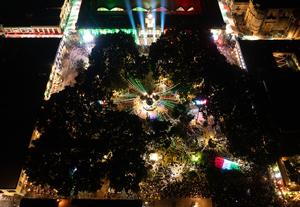 (250916) — OAXACA, 16 septiembre, 2025 (Xinhua) — Vista aérea tomada con un dron el 15 de septiembre de 2025 de personas asistiendo a la ceremonia del «Grito de Dolores» para celebrar el Día de la Independencia de México, en la plaza del Zócalo, en la ciudad de Oaxaca, en el estado de Oaxaca, México. México celebra su Día de la Independencia el 16 de septiembre. (Xinhua/Li Mengxin) (oa) (ah) (vf)