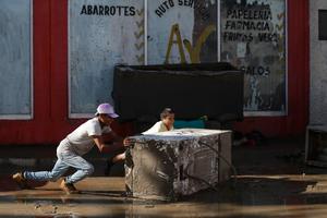 (251012) -- POZA RICA, 12 octubre, 2025 (Xinhua) -- Personas empujan un mueble por una calle inundada por las lluvias, en la ciudad de Poza Rica, en el estado de Veracruz, México, el 12 de octubre de 2025. El estado mexicano de Veracruz, en la región oriental del país, enfrenta una severa emergencia derivada del desbordamiento del río Cazones que arrasó con viviendas, caminos y cosechas, en la región norte de la localidad del Golfo de México. (Xinhua/Francisco Cañedo) (fc) (oa) (da)