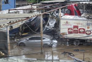 (251011) -- POZA RICA, 11 octubre, 2025 (Xinhua) -- Imagen del 11 de octubre de 2025 de un vehículos varados en una calle inundada por las lluvias, en la ciudad de Poza Rica, en el estado de Veracruz, México. A 37 subió el número de muertos por las intensas lluvias registradas en los últimos días en el centro y oriente de México, informó el sábado la gubernamental Coordinación Nacional de Protección Civil. (Xinhua/Paco De Luna) (oa) (da)