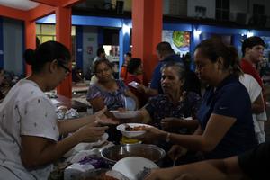(251013) -- POZA RICA, 13 octubre, 2025 (Xinhua) -- Imagen del 12 de octubre de 2025 de personas recibiendo alimentos en un albergue para damnificados por las lluvias, en la ciudad de Poza Rica, en el estado de Veracruz, México. Las autoridades de México informaron el lunes que aumentó a 64 el número de personas fallecidas por las lluvias e inundaciones registradas entre el 6 y el 9 de octubre en los estados de Veracruz, Puebla, Hidalgo y San Luis Potosí, consideradas las más intensas del año en esa región del país. (Xinhua/Francisco Cañedo) (fc) (rtg) (ah) (ce)