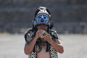 (250321) -- TEOTIHUACAN, 21 marzo, 2025 (Xinhua) -- Una persona participa en un ritual frente a la Pirámide del Sol en el marco del equinoccio de primavera, en la zona arqueológica de Teotihuacán, en Teotihuacán, México, el 21 de marzo de 2025. (Xinhua/Francisco Cañedo) (fc) (oa) (ra) (ce)