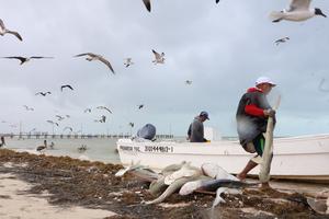 (260321) -- YUCATAN, 21 marzo, 2026 (Xinhua) -- Imagen del 19 de marzo de 2026 de pescadores acomodando la captura del día tras una jornada de pesca en el mar, en el puerto de Progreso, en el estado de Yucatán, México. Investigadores del Centro de Investigación y de Estudios Avanzados (Cinvestav) de México desarrollan un sistema de monitoreo y predicción oceánica en tiempo real para anticipar fenómenos de marea roja que afectan de manera grave la pesca, el turismo y el equilibrio ambiental en la península de Yucatán, en el homónimo estado del sureste mexicano. (Xinhua/Str) (fc) (jg) (da)