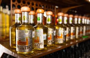(250828) -- ZACATECAS, 28 agosto, 2025 (Xinhua) -- Imagen del 26 de agosto de 2025 de botellas de mezcal en una tienda, en Teúl de González Ortega, en el estado de Zacatecas, México. En Teúl de González Ortega, un municipio en el sur de Zacatecas, el agave es un cultivo importante. El mezcal se produce tostando corazones de agave, extrayendo el jugo, fermentándolo y destilándolo, y algunos lotes se añejan adicionalmente en barricas de madera. (Xinhua/Li Mengxin) (jg) (ah) (vf)