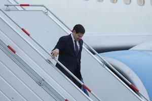 (250902) -- ZUMPANGO, 2 septiembre, 2025 (Xinhua) -- El secretario de Estado estadounidense, Marco Rubio, desciende del avión a su llegada al Aeropuerto Internacional Felipe Angeles, en Zumpango, México, el 2 de septiembre de 2025. El secretario de Relaciones Exteriores de México, Juan Ramón de la Fuente, recibió el martes en el Aeropuerto Internacional Felipe Angeles a Rubio, quien realiza una visita de trabajo al país latinoamericano para reforzar la cooperación bilateral en distintos ámbitos. (Xinhua/Francisco Cañedo) (fc) (vf) (ce)