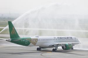 (250825) -- ZUMPANGO, 25 agosto, 2025 (Xinhua) -- Imagen del 25 de agosto de 2025 de la aeronave EMBRAER E-195 de la Aerolínea del Estado Mexicano "Mexicana" recibiendo un saludo de agua previo a su primer vuelo en el Aeropuerto Internacional Felipe Angeles, en Zumpango, México. (Xinhua/Francisco Cañedo) (fc) (oa) (ah) (vf)