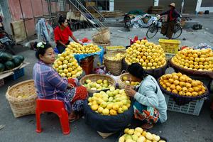 (250512) -- MANDALAY, 12 mayo, 2025 (Xinhua) -- Imagen de 11 de mayo de 2025 de personas vendiendo mangos en un mercado local, en Mandalay, Myanmar. (Xinhua/Myo Kyaw Soe) (oa) (ah) (ce)