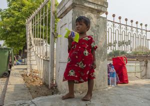 (250404) -- MANDALAY, 4 abril, 2025 (Xinhua) -- Una niña come alimentos distribuidos en un refugio temporal, en Mandalay, Myanmar, el 4 de abril de 2025. (Xinhua/Cai Yang) (rtg) (ra) (vf)