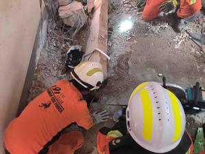 (250401) -- NAY PYI TAW, 1 abril, 2025 (Xinhua) -- Imagen del 1 de abril de 2025 de la operación de rescate de una mujer atrapada, en Nay Pyi Taw, Myanmar. Una mujer de 63 años atrapada bajo los escombros durante 91 horas después de un fuerte terremoto en Myanmar fue rescatada el martes en Nay Pyi Taw, informó el Departamento de Servicios de Bomberos de Myanmar (MFSD, por sus siglas en inglés). (Xinhua/MFSD) (oa) (ah) (vf)
